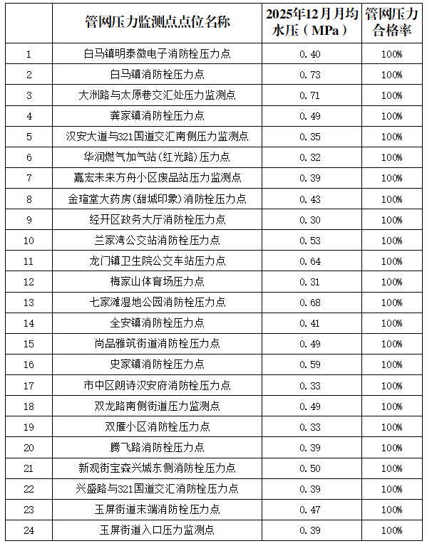 内江市水务有限责任公司2025年12月管网压力月报